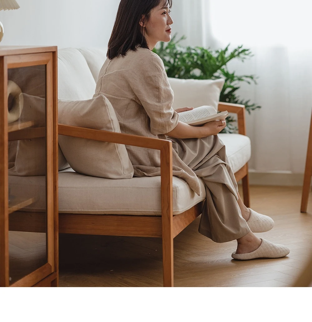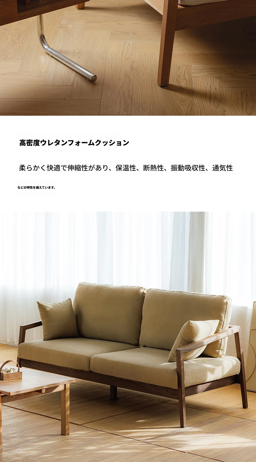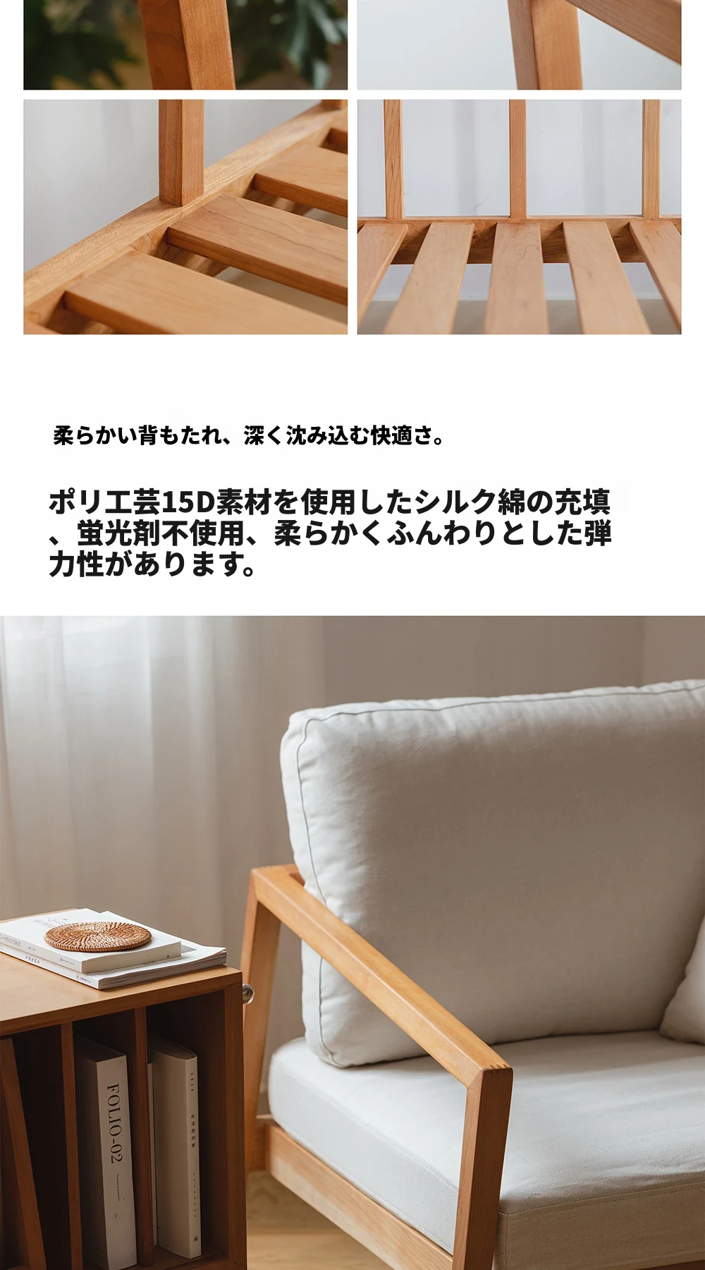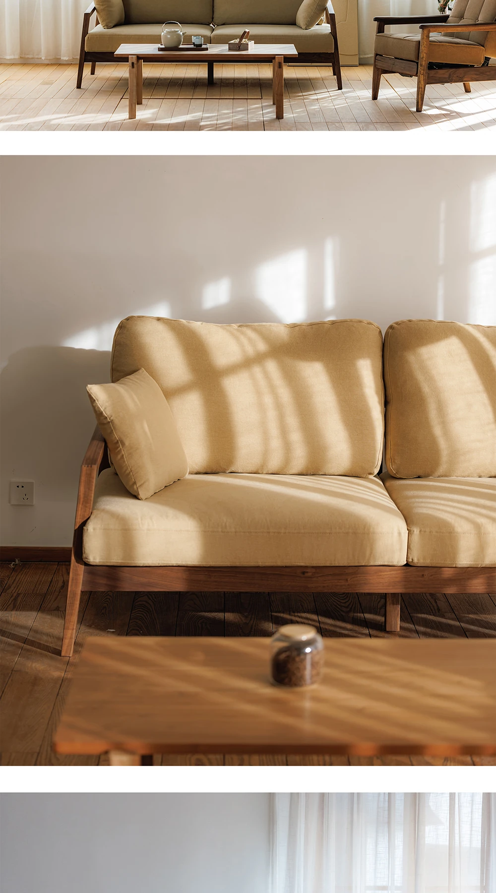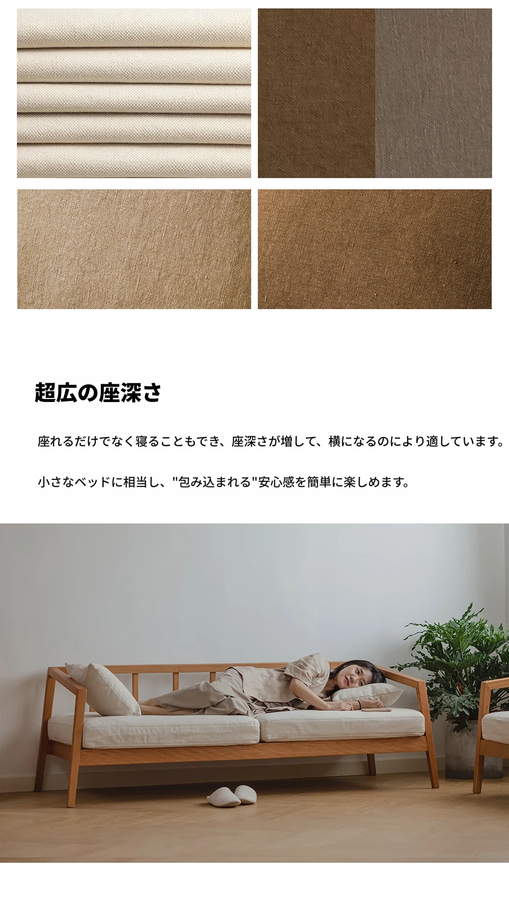 山のような心地よさ、全実木の和風ソファ - チェリーウッドとブラックウォールナットを使用したリビング用布製ソファ、コットンリネンで贅沢なひとときを。