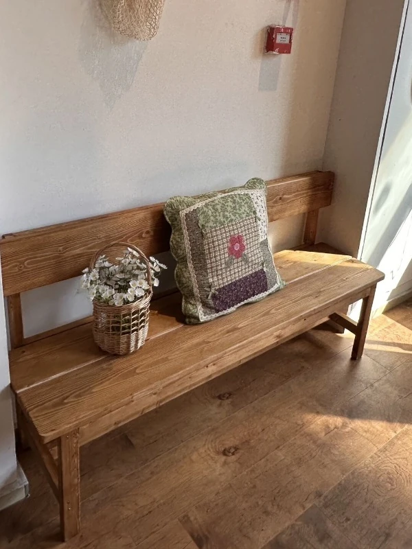 ヴィンテージ感漂う無垢材ロングベンチ - グラウンドオーク色のソファ背もたれ付き、クラシックなウォールナットカラーの店舗用休憩椅子。レトロな雰囲気で、どんな空間にもぴったり。