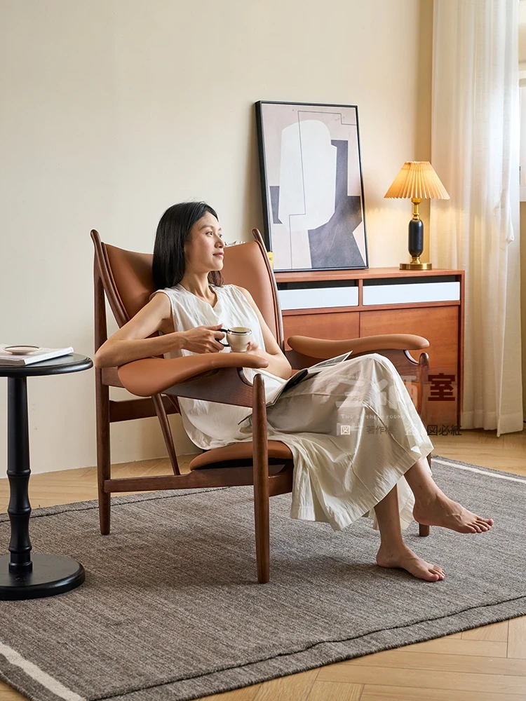 北欧デンマークデザインのウッド一人掛けレトロソファチェア - サドルレザー仕立てで、リビングルームにぴったりの心地よい休息空間を提供します。スタイリッシュで快適なデザインで、あなたのインテリアを華やかに演出!